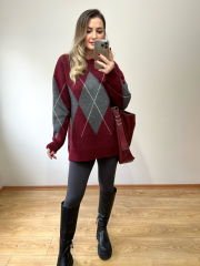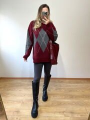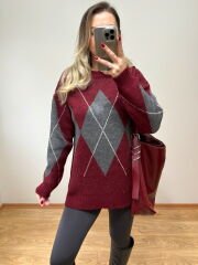 BORDO ÜZERİ GRİ BAKLAVA DESENLİ KAZAK