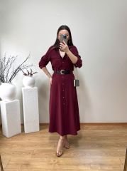 GABARDİN TENSEL KUMAŞ PREMİUM KALİTE YANLARDAN CEPLİ VE KEMERLİ ELBİSE BORDO