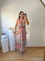 MARKA MODEL GÖĞÜS ALTINDAN LASTİKLİ ŞİFON KUMAŞ ASİMETRİK KESİM ELBİSE