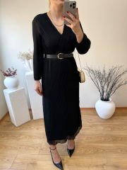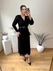ÖZEL TASARIM KEMERLİ ŞİFON KUMAŞ PİLİSE ELBİSE SİYAH