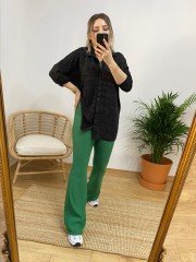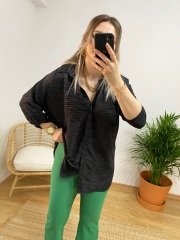 SATEN PİLİSE KUMAŞ SİYAH RAHAT KALIP ARKASI UZUN GÖMLEK