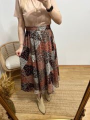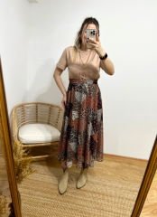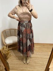 ŞİFON KUMAŞ İÇİ ASTARLI BELİ LASTİKLİ ÇITIR DESEN KAHVE RENGİ ETEK